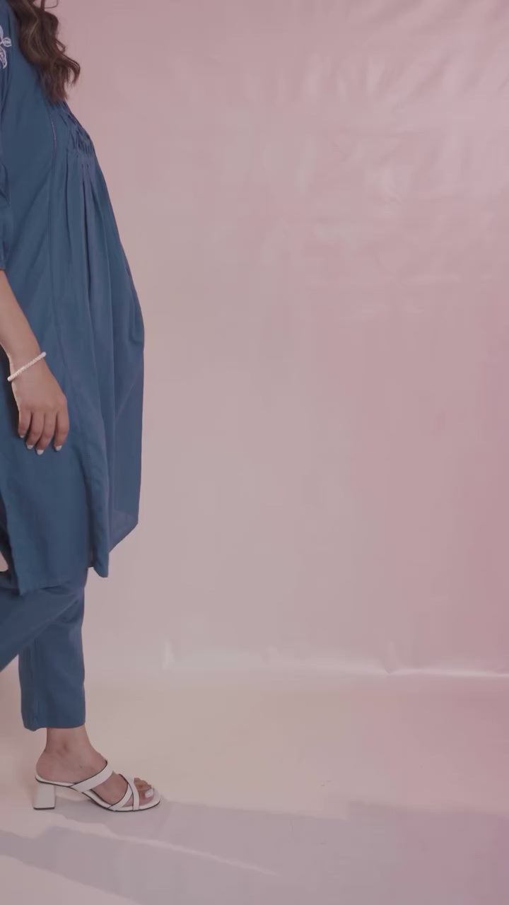 Effortlessly elegant, this teal blue cotton kurta set features a gently gathered front for a flowy silhouette and all-day comfort. The kurta showcases delicate white embroidery on the puffed three-quarter sleeves, adding a touch of charm and detail. Paired with straight-cut matching pants, this ensemble is perfect for casual outings, workwear, or relaxed gatherings. Crafted from breathable cotton, it ensures comfort and style in every step.