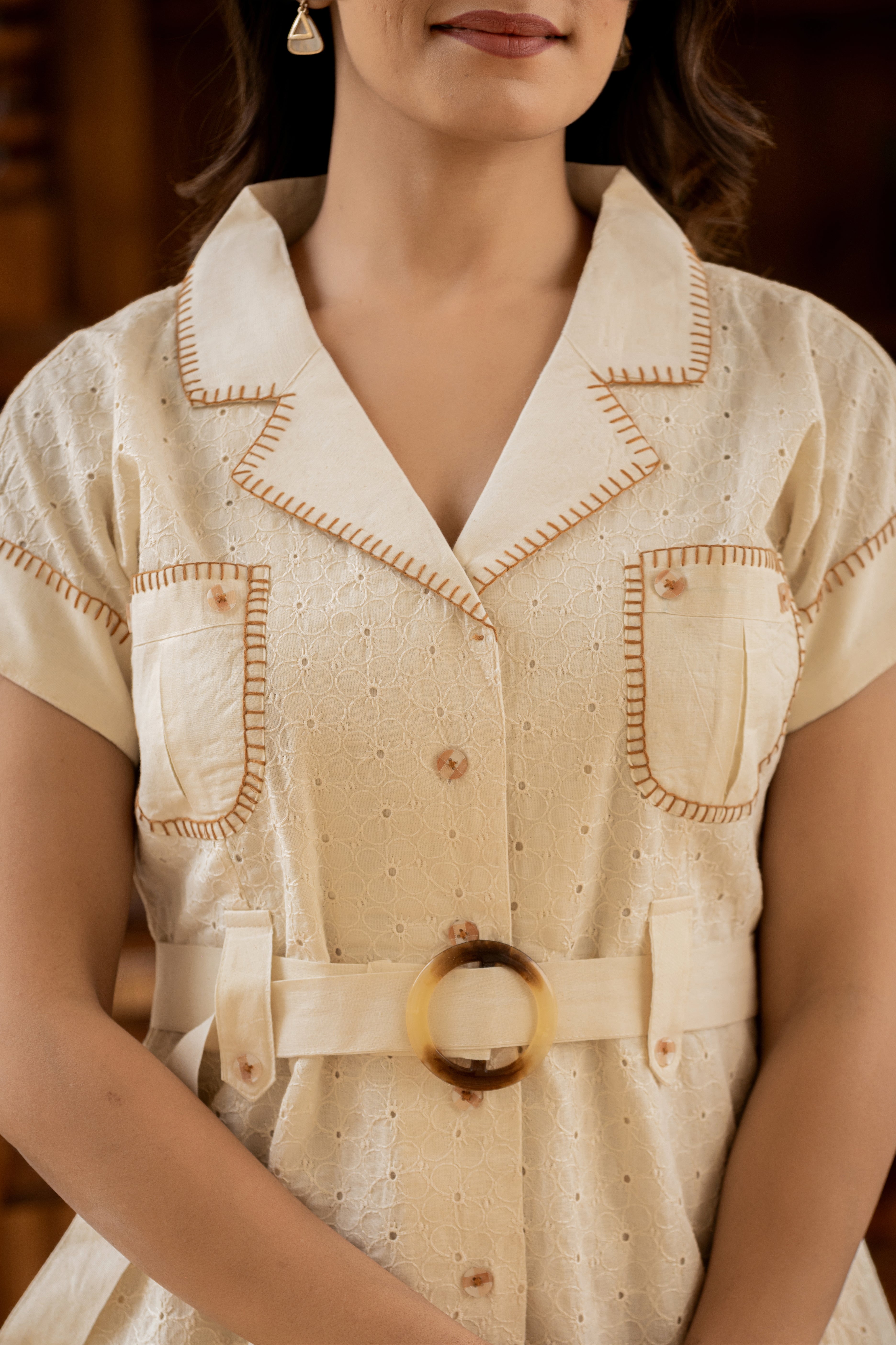 Embrace simplicity and elegance with this Cotton Short Dress, made from soft, breathable Schiffli cotton fabric. Featuring a stunning floral self-design, this dress is accented with a blanket stitch and includes a fabric belt for added style. The off-white color and classic A-line silhouette, with roll-up short sleeves and a collar, make it perfect for warm weather. With full cotton lining, this dress offers both comfort and sophistication, making it a must-have for your wardrobe.