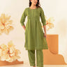 Step into effortless style with this elegant olive green kurta set, crafted from soft, breathable cotton for all-day comfort. The kurta features intricate pleated detailing on the front, a buttoned neckline, and three-quarter sleeves, adding a touch of sophistication to your everyday or casual look. Paired with matching straight-cut pants and finished with delicate lacework at the hem, this ensemble is perfect for summer outings, workwear, or casual gatherings. Complete the look with minimalist accessories and sandals for a chic, graceful appearance.