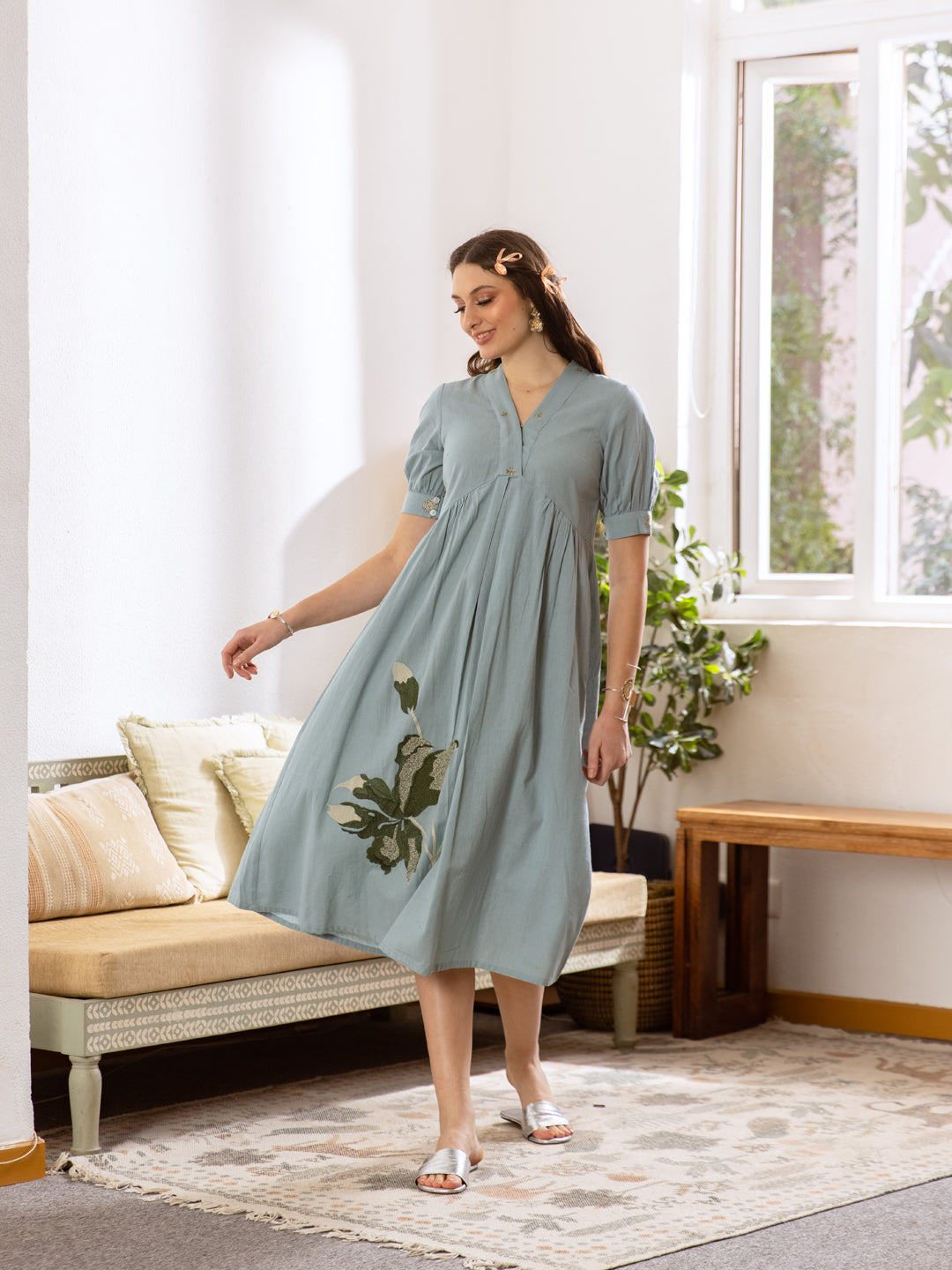 Step into effortless summer dressing with this powder blue cotton flaired midi dress, designed for comfort and everyday elegance. Crafted from breathable cotton, the dress features subtle painted detailing that adds a soft artistic touch to its easy, flowing silhouette.