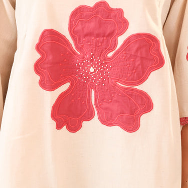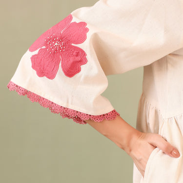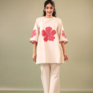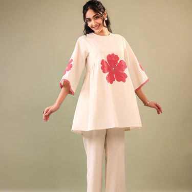 This off‑white patch embroidery co‑ord set features a crisp cotton‑flex top adorned with bold pink floral patches on a round neckline, complemented by lace‑trimmed ¾ sleeves with adda detailing. The matching flare pants offer an elastic waist and side pockets for comfort and convenience, making it an elegant yet easygoing choice for festive gatherings or everyday charm