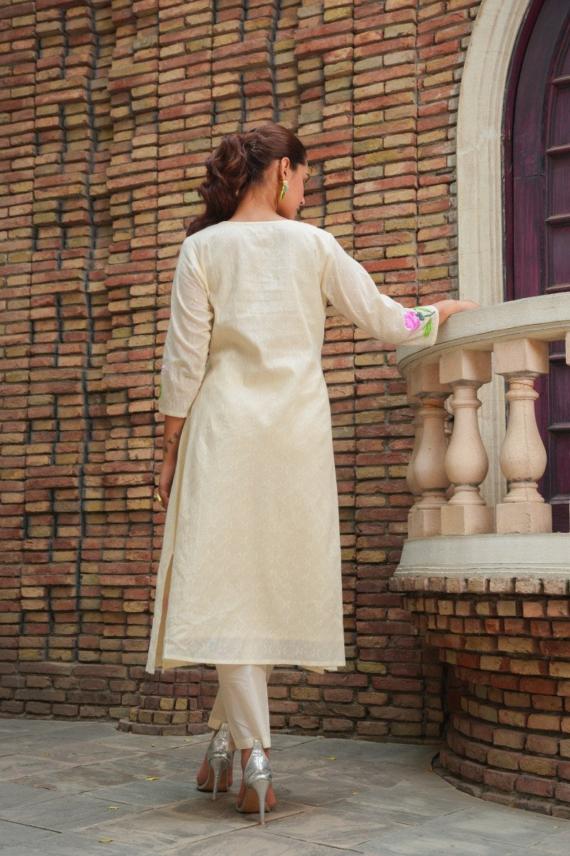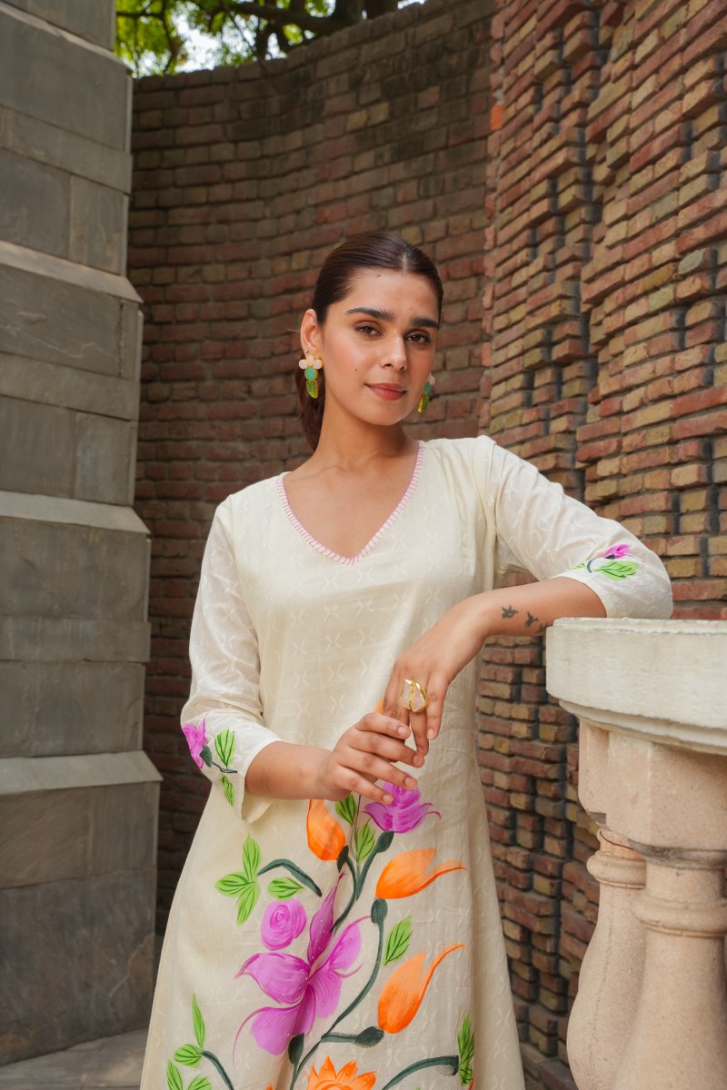 White Cotton Floral Painted Kurta Set for Women